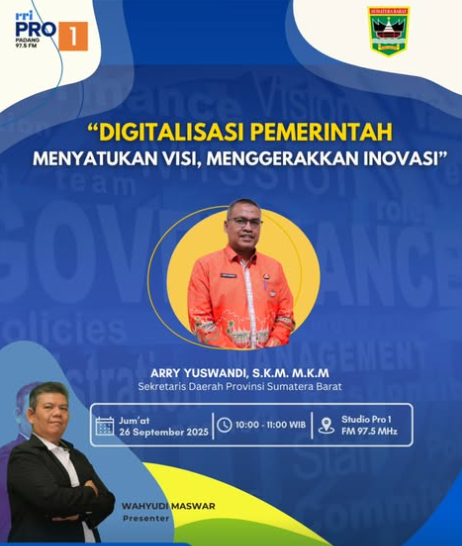 Masyarakat Sumatera Barat diajak untuk menyimak siaran Studio Pro 1 RRI Padang yang menghadirkan Sekretaris Daerah Provinsi Sumatera Barat, Arry Yuswandi, S.KM., M.KM., dengan tema “Digitalisasi Pemerintah: Menyatukan Visi, Menggerakkan Inovasi”. Acara akan disiarkan Jumat, 26 September 2025, pukul 10.00 – 11.00 WIB di RRI Pro 1 FM 97.5 MHz.
