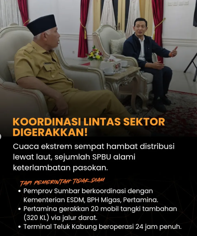 Gubernur menyampaikan bahwa pihaknya telah melakukan koordinasi bersama Dinas ESDM Sumbar, BPH Migas, serta Pertamina guna memastikan setiap hambatan dapat teratasi dengan segera.