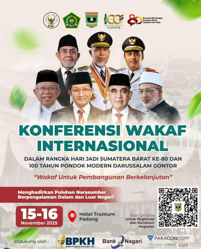 PADANG— Pemerintah Provinsi Sumatera Barat bekerja sama dengan Badan Wakaf Indonesia (BWI), Kementerian Agama, serta Pondok Modern Darussalam Gontor akan menggelar Konferensi Wakaf Internasional pada 15–16 November 2025 di Hotel Truntum Padang. Kegiatan berskala global ini menjadi bagian dari rangkaian Peringatan Hari Jadi Provinsi Sumatera Barat ke-80 sekaligus memperingati 100 Tahun Pondok Modern Darussalam Gontor.