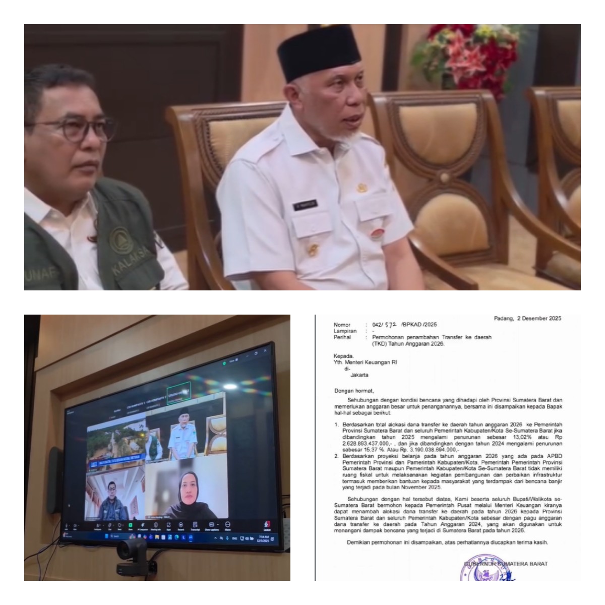 Gubernur Sumatera Barat (Sumbar), Mahyeldi Ansharullah, mengusulkan kepada Pemerintah Pusat agar membatalkan pemotongan anggaran Transfer Ke Daerah (TKD) tahun 2026 untuk Sumbar, yang mencapai lebih dari Rp2,6 triliun. Usulan ini disampaikan mengingat Sumbar saat ini sedang melakukan penanggulangan dan pemulihan besar-besaran pascabencana hidrometeorologi yang melanda berbagai wilayah.