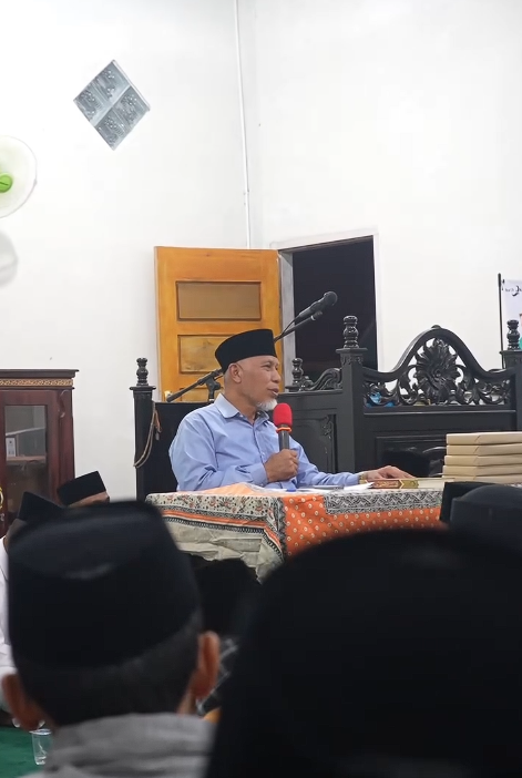 Di hadapan jamaah yang memadati masjid, Mahyeldi menekankan pentingnya pembinaan generasi muda sejak dini agar tumbuh menjadi generasi penerus bangsa yang berilmu, berakhlak mulia, dan memiliki landasan iman yang kuat.